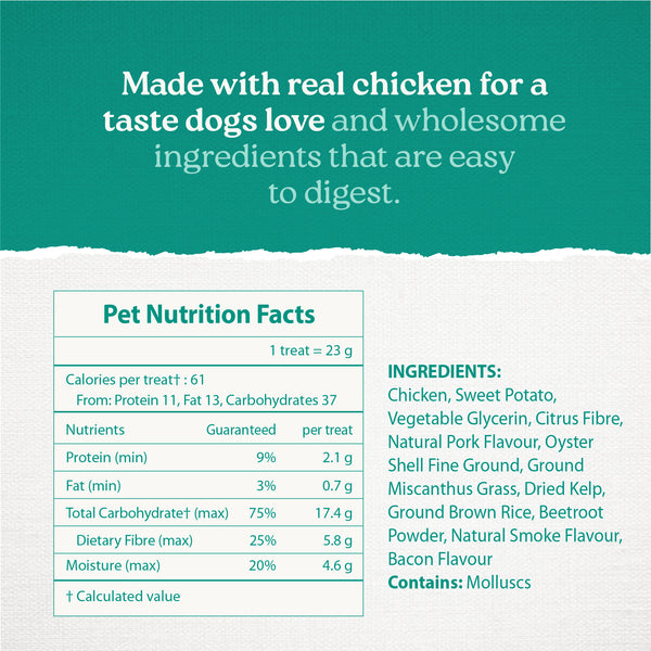 A gently textured outer layer helps scrub away buildup, while the softer inner core helps wipe away what’s left behind. Star-shaped ridges reach into hard-to-clean areas, and kelp helps neutralize odour for fresher breath. Made with real chicken with a dash of bacon flavour for a taste dogs love, these dental sticks make daily oral care simple, effective, and something dogs actually look forward to.
